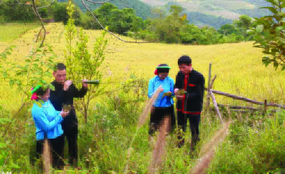 Los muchachos y las muchachas de la etnia San Chi entonan melodías de Sóong Cọ en la colina. (Foto: vannghequandoi.com.vn)