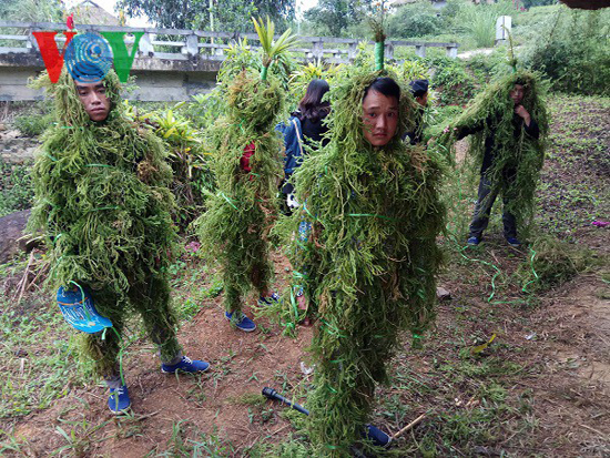 Hombres disfrazados de autóctonos de la selva bailan en el ritual en homenaje a los antepasados. (Foto: VOV) |