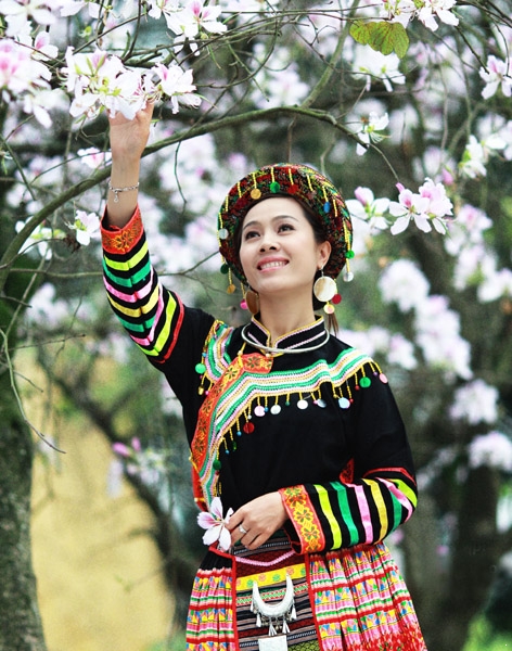 La flor de bauhinia enaltece la belleza natural de muchachas étnicas