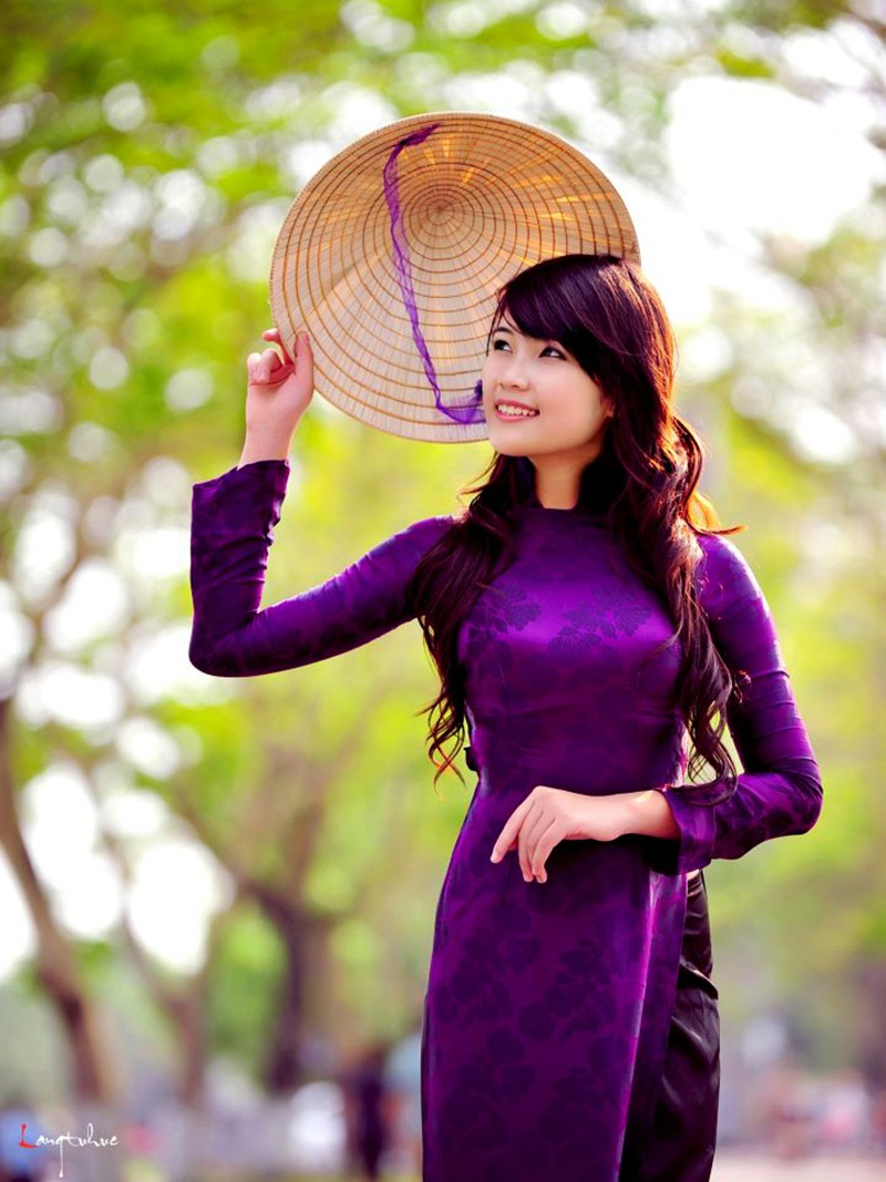 Una muchacha vestida de "Áo dài" (Túnica tradicional de Vietnam) morada,