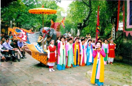 Según la tradición, la fiesta del “cheo Tau” duraba del l5 al 21 de enero lunar. Durante 7 días y noches los aldeanos se turnaban en cantar de la mañana a la noche y al revés. La festividad se inició con una ceremonia en el Templo de Voi Phuc (elefante arrodillado) y después se portaron los palanquines hacia la casa comunal aldeana. Lo especial es que las mujeres bonitas son participantes principales. Las más hermosas interpretan el papel de “Chua tau” (Princesa de barco) o “Cai tau” (capitán de barco) y “Con tau” a cargo de jovencitas de l3 a l6 años de edad que abordan un bote y un elefante para formar un coro. Quizás por esto el pueblo lo llama ópera tradicional. El contenido de las canciones alaba las contribuciones del espíritu de Tong Goi, Van Di Thanh. En la parte de los rituales, se interpretan melodías de gran solemnidad y cuando cae la noche se interpretan trovas románticas suaves y graciosas. En la parte del festejo, además de las danzas y cantos se organizan juegos populares como ajedrez, competición de cocinar arroz y columpio. Investigadores revelaron que el “cheo Tau” se realizó majestuosamente en l683.