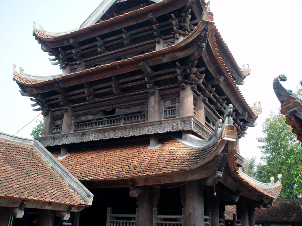 El campanario de este templo budista es quizás la obra más impresionante de todas. Mide más de 11 metros de altura y cuenta con tres pisos. En el primero se instaló un gong de piedra de un metro y 20 de altura, y en el segundo se colgó una gran campana de bronce fundida en 1686, mientras en el tercero se hallan otros dos más pequeños elaborados en 1976. Nguyen Van Nam, un turista observó: “No consigo entender como pudieron subir esos objetos tan pesados cuando no existían grúas ni poleas. Pienso que nuestros ingeniosos artesanos excavaron la tierra y crearon una vía adentro para subir y colgar las campanas. Me parece que esto explica el por qué hay tres bellos lagos en el patio de la pagoda”.