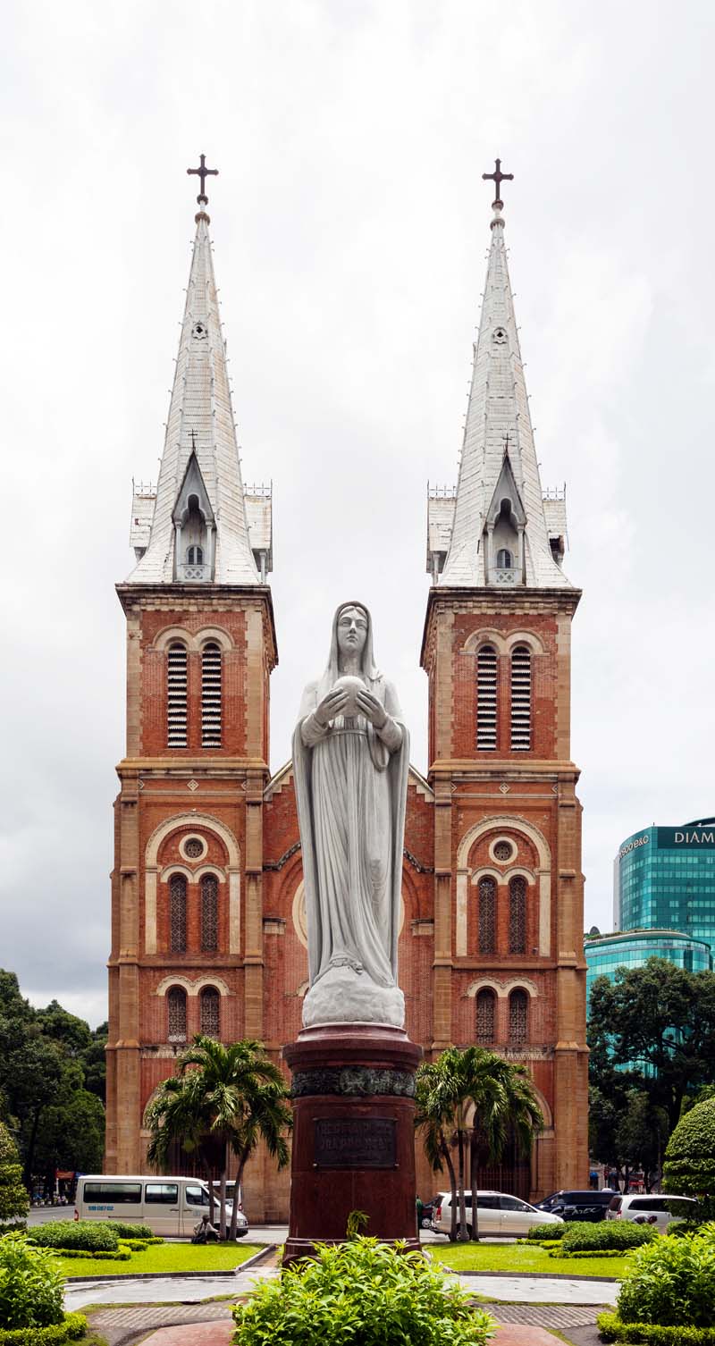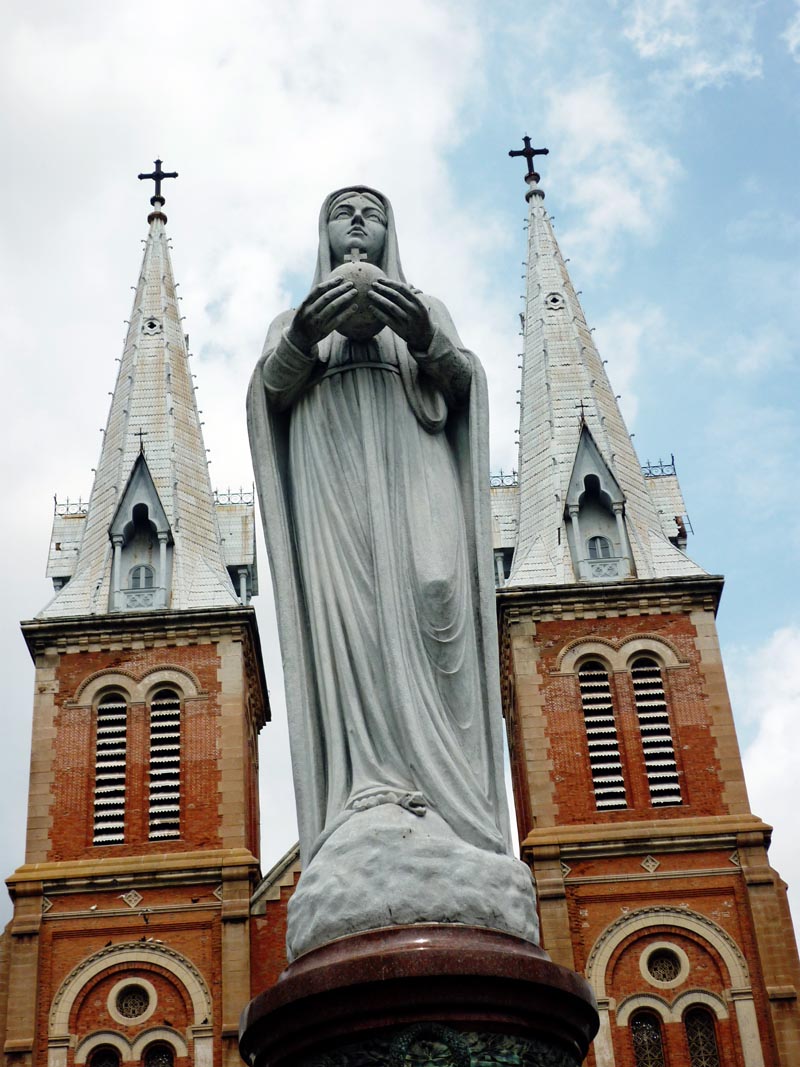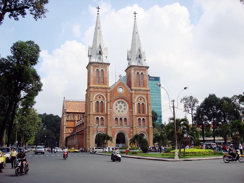 Situada en el número l de la Plaza de la Comuna de París, distrito l, Ciudad Ho Chi Minh, la Catedral de Notre Dame se llama también Palacio Real- Templo Principal de la Purísima Concepción. Se trata de una obra religiosa edificada tempranamente después de la Gran Catedral de Hanoi. A poco tiempo de ocupar Saigón (hoy Ciudad Ho Chi Minh) los franceses erigieron un santuario para que los católicos galos efectuaran ceremonias religiosas. La construcción se inició en l877. Quizás por esto la obra está marcada por el estilo arquitectónico religioso de la Europa de aquel tiempo. El arquitecto Nguyen Huu Thai quien dedicó mucho tiempo a investigar la historia de las construcciones francesas en Ciudad Ho Chi Minh dio a conocer que las huellas arquitectónicas dejadas en Saigón se plasmaron en distintas etapas y la Iglesia de Notre Dame pertenece al primer período. “Esta etapa correspondía al de los almirantes franceses y la arquitectura seguía el estilo militar con calles rectas. En las encrucijadas se levantaban grandes edificios plenos de impactantes características galas. Las primeras obras fueron el Palacio Norodom) y la Catedral de Notre Dame.”