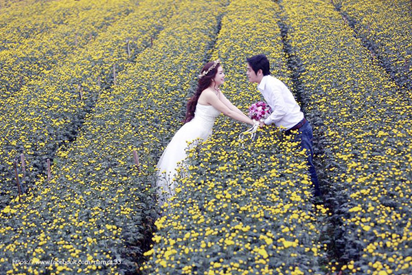 ![]() Una pareja toma fotos de boda en la aldea de floricultura de Thai Phien