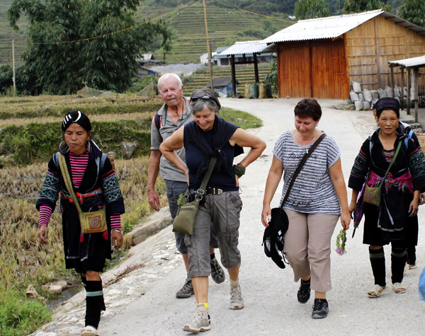 Turistas extranjeros recorren aldeas étnicas en Sapa
