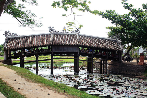 Algo muy especial de la aldea es el puente de madera de l7 metros de largo y 4 de ancho. A lo largo de sus barandas hay bancas de madera para que los transeúntes descansen. El puente está en el cruce de los ríos Thanh Toan y Nhu Y. Su techo está cubierto de tejas en forma de cilindro, esmaltadas, sobre el cual una pareja de dragones contemplan el sol. El puente se divide en 7 partes cuya arquitectura es rustica, solo con diseños redondos y cuadrados, creando belleza. La construcción es levantada por un sistema de pilares y tablas de cemento, creando una curva para facilitar la circulación de embarcaciones. Nguyen Van Thanh, habitante de Hue, dice: “El puente fue edificado por orden de Tran Thi Dao, esposa de un rey bajo la dinastía Le en el año l776.Ella no tenía hijos y veía que los aldeanos encontraban muchas dificultades al cruzar el canal. Quería pedir hijos y según la ideología budista, financió la construcción del puente para traer felicidad al pueblo. Tras el nacimiento de la obra el rey la alabó y le otorgó honores. En l920 en la época del monarca Khai Dinh, los aldeanos le rendían culto y edificaron un templo en el medio del puente. Es una construcción de madera de alto valor arquitectónico.”