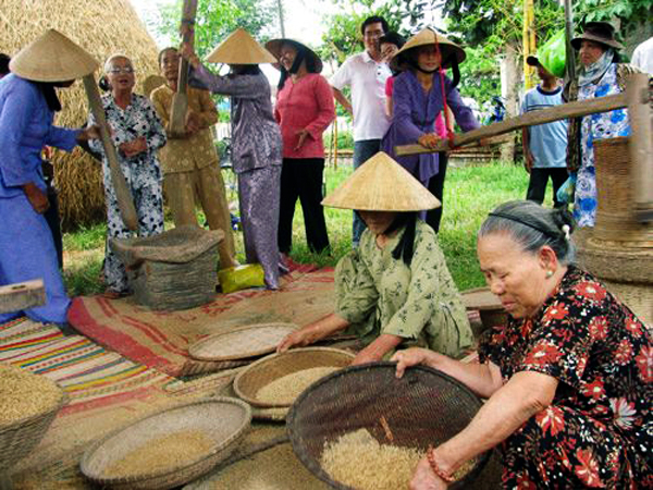 Después de pasar el puente se ve la casa de exhibición, donde hay cientos de instrumentos agrícolas, relacionados con las actividades de cultivo de arroz de agua como arados, trillos, hoces y molinos de arroz, además de los utensilios de pesca como redes, nasas y recuerdos de bambú y mimbre. El guía turístico Nguyen Thanh Trung, agregó: “Aquí podemos presenciar el proceso de producción de arroz desde la siembra hasta la cosecha, procesamiento y molienda. Especialmente a los niños les gustan mucho estas actividades. Además, los adultos pueden probar comidas sabrosas de la aldea mientras los niños y niñas pueden participar en las actividades cotidianas muy afectuosas e interesantes.”