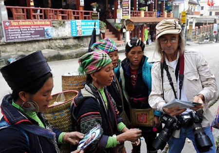 Un turista extranjero intercambia con mujeres étnicas de Sapa,