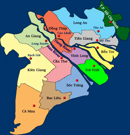 El mapa de la región del Delta del río Mekong en el sur de Vietnam
