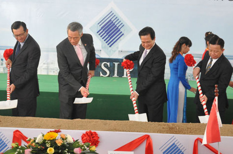 ![]() El primer ministro vietnamita, Nguyen Tan Dung y su homólogo singapurense, Lee Shien Lung realizan el acto de colocar la primera piedra del parque industrial VSIP Quang Ngai