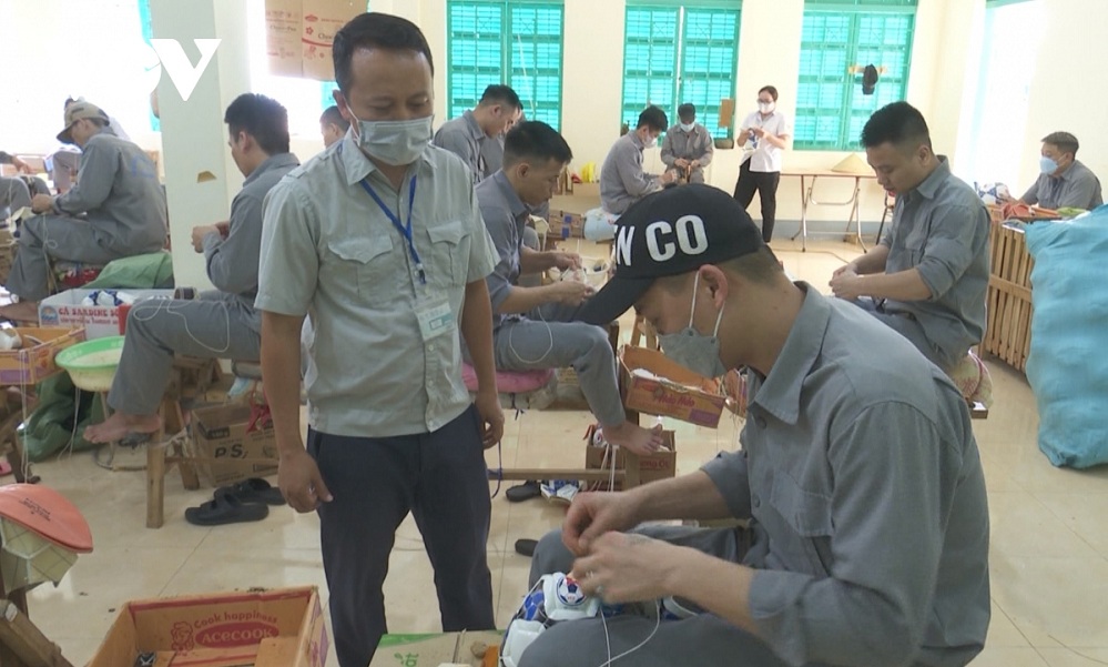 Estudiantes aprenden a coser pelotas de cuero en el Centro de Tratamiento de Adicciones a las Drogas en la provincia de Son La.