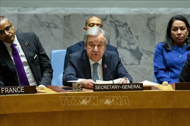 El secretario general de la ONU, António Guterres, interviene en la reunión. (Foto: Xinhua/VNA) |