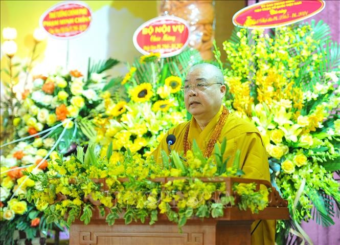 El bonzo superior Thich Thanh Nhieu, vicepresidente del Consejo Administrativo de la Sangha Budista de Vietnam pronuncia el mensaje del Día 2565 del Nacimiento, la Iluminación y la Muerte de Buda. (Foto: VNA) |