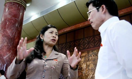 ![]() H’Luộc N’tơr conversó con un colega en la delegación parlamentaria de Dak Lak afuera de la sala de reuniones