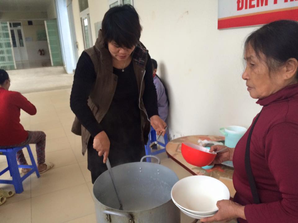 ![]() La maestra Nguyen Thi Hien (vestida de negro) distribuye cuencos de gachas de arroz a pacientes pobres de la Policlínica de Bao Thang