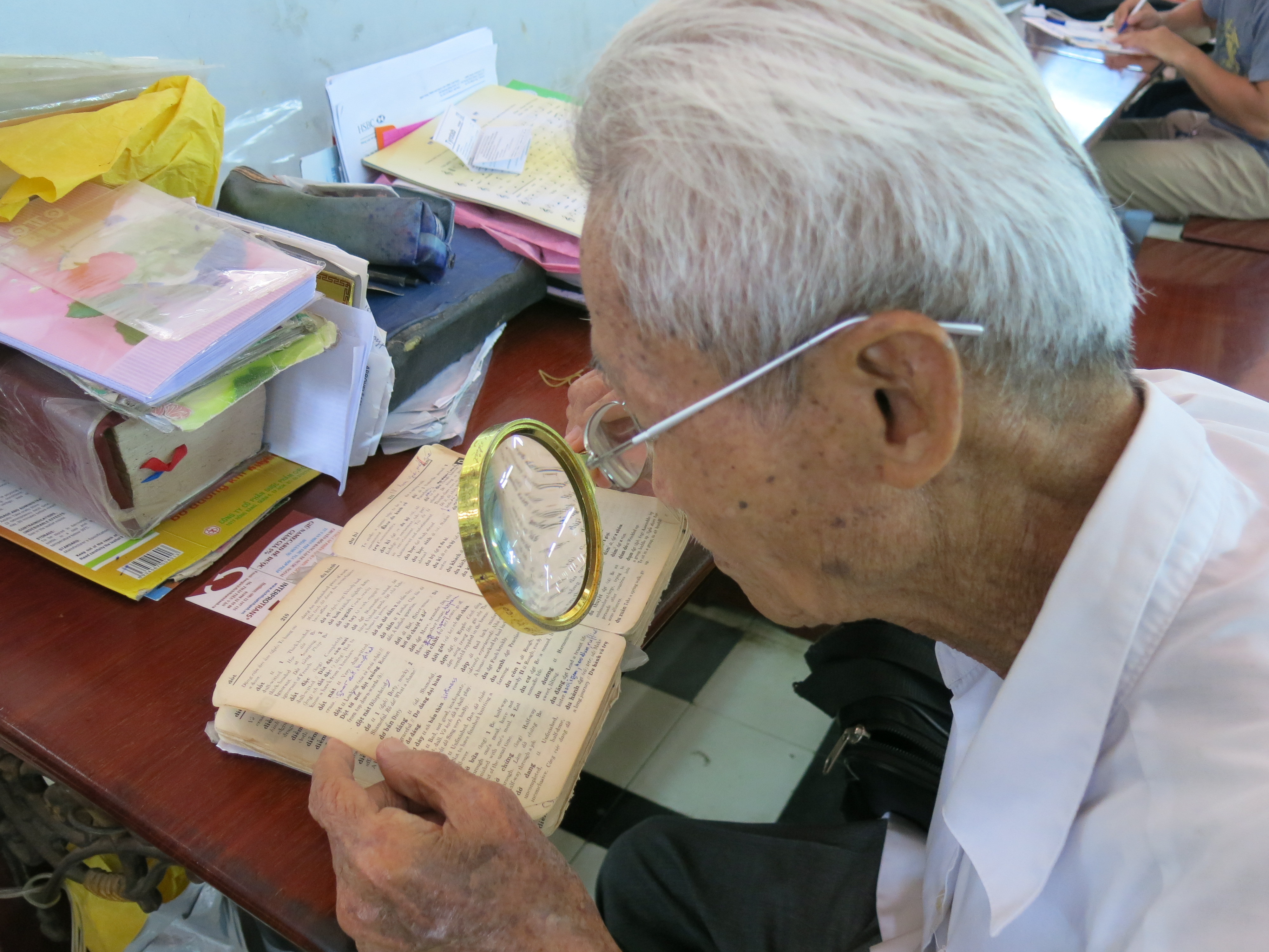 En los últimos 27 años, Ngo va al trabajo con un maletín que contiene diccionarios del inglés, francés, bolígrafos, cuadernos y especialmente su lupa, que le ayuda a buscar las palabras cuando está traduciendo las cartas. “Los diccionarios son indispensables. A veces tengo que consultarlos porque estoy mayor, no recuerdo todo. Sin embargo, algunas palabras no salen. Si traducimos “Cong An” (seguridad pública), los extranjeros no lo entienden, por eso debe ser traducido como “Canh Sat” (policía). Y hay palabras puramente vietnamitas como “xe om” tampoco se menciona pero trato de buscar la forma para explicárselo a la gente”.