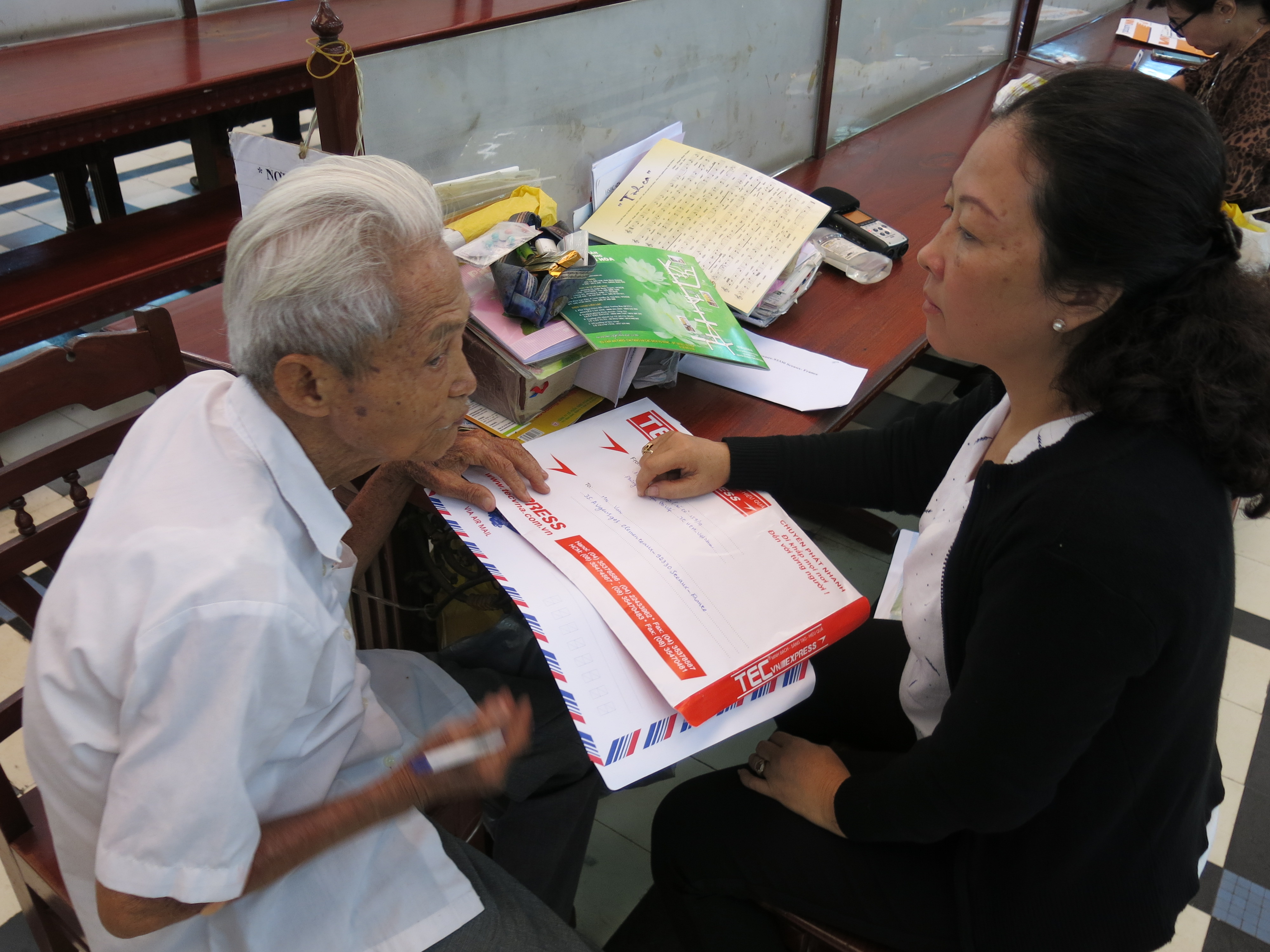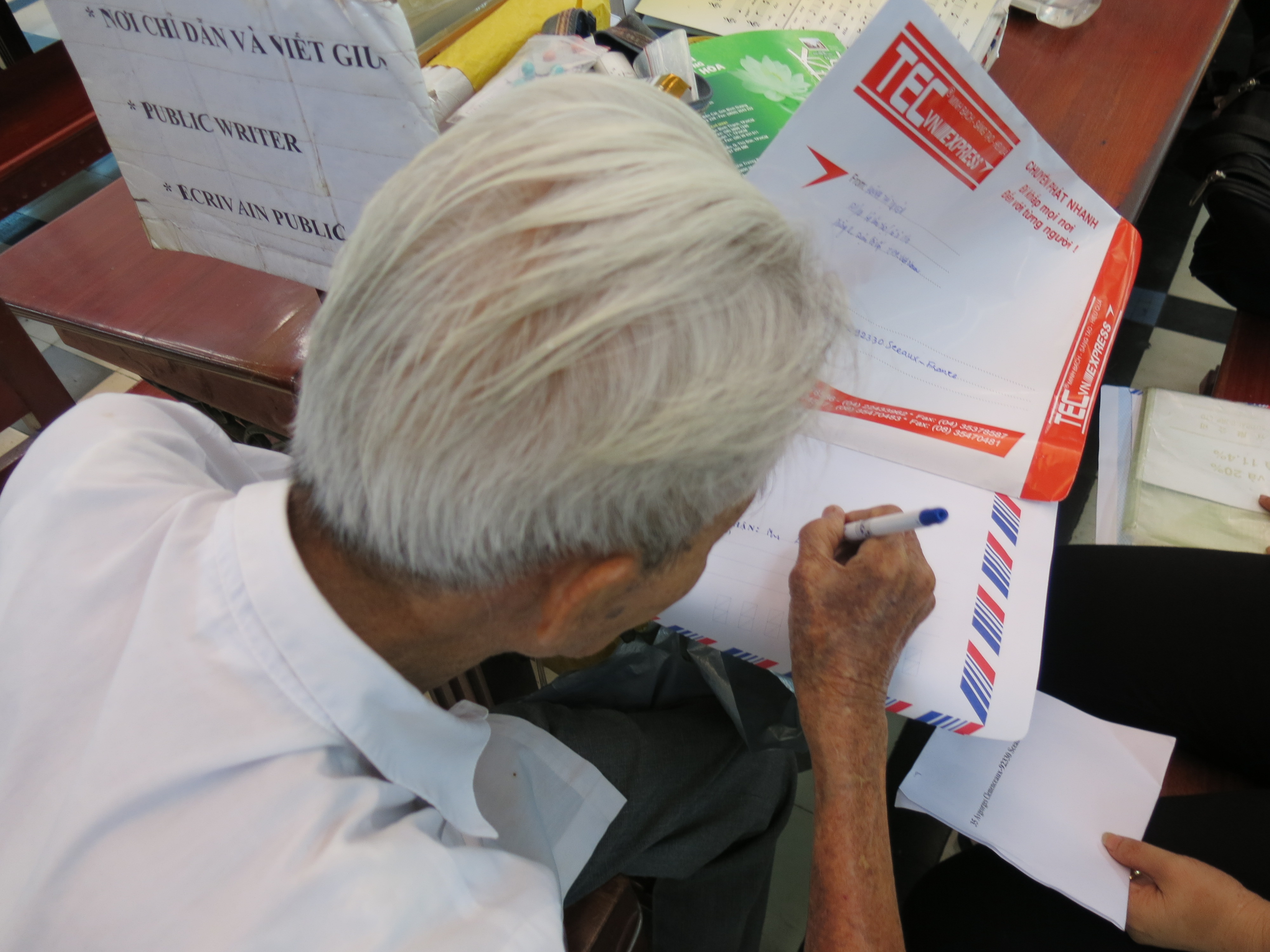 Nacido en 1930, Duong Van Ngo ha trabajado como escritor epistolar público durante los 27 años. Todos los días se encuentra sentado al final de una larga mesa de madera, al lado del letrero “Información y Asistencia por escrito”. Está dispuesto a traducir cartas del vietnamita al inglés o francés y viceversa. También ayuda a los clientes a escribir direcciones de los destinatarios en el extranjero.