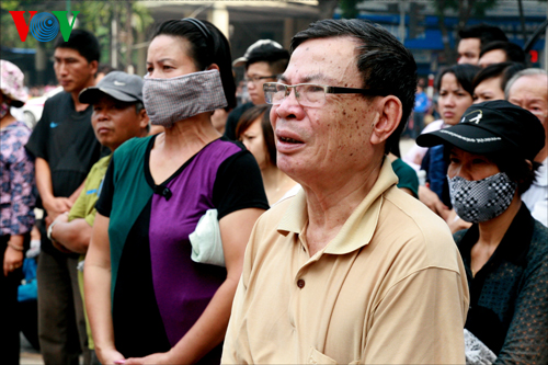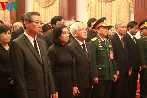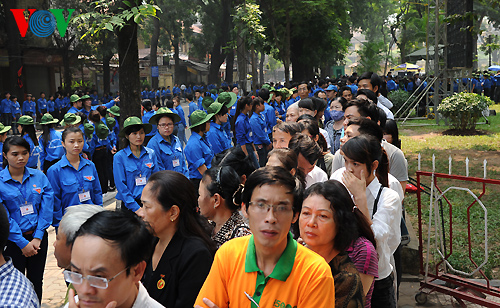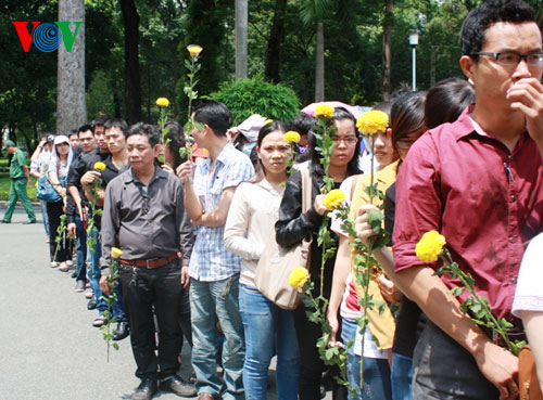 (VOVworld) – El Comité Central del Partido Comunista de Vietnam, la Asamblea Nacional, el el Gobierno y el Frente de la Patria Nacional organizan en los días 12 y 13 de octubre un funeral de nivel estatal para el general Vo Nguyen Giap, en la Casa Funeraria Nacional en la calle de Tran Thanh Tong en Hanoi. Desde la madrugada, miles de personas provenientes de todo el país han hecho una cola larga para poder depositar inciensos y flores en memoria al general de su corazón. Mientras tanto, en otras ciudades y provincias de la nación, se efectúan similares ceremonias para honrar al legendario Giap.