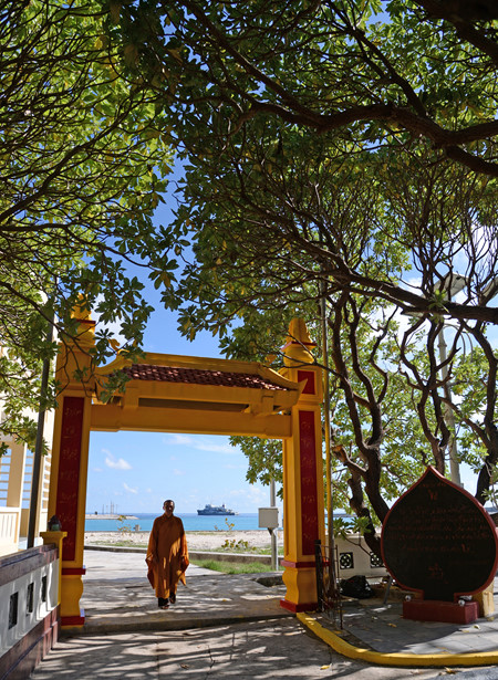 Un monje entrando en la pagoda en la isla de Sinh Ton