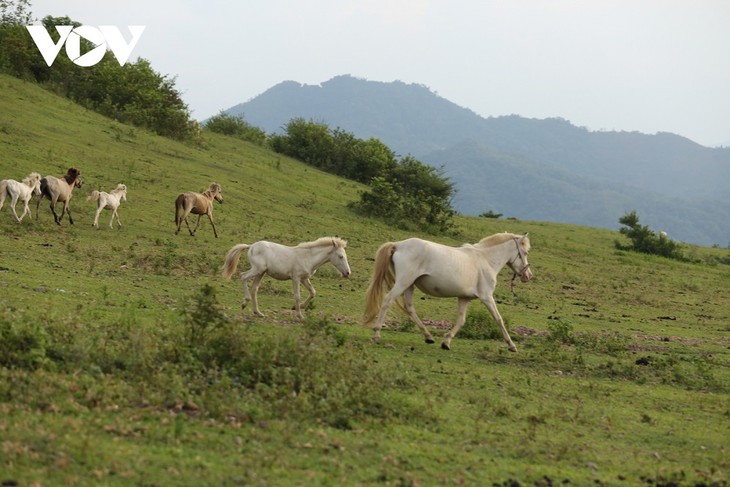 Los caballos blancos pastando pacíficamente crean bellas imágenes de Khau Sao. (Foto: baolangson.vn) |