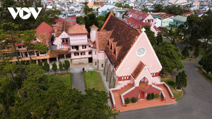 | El techo de la iglesia está hecho según el estilo de Tay Nguyen, con ladrillos rojos. Está libre de las estrictas pautas de la arquitectura religiosa en Europa. No tiene campanario como las otras iglesias europeas. |