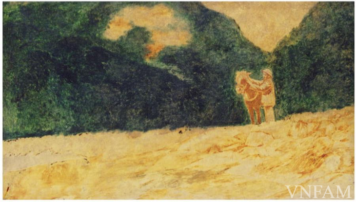 | El tío Ho en un viaje de trabajo - grabado en madera, 1982, pintor Nguyen Nghia Duyen. |