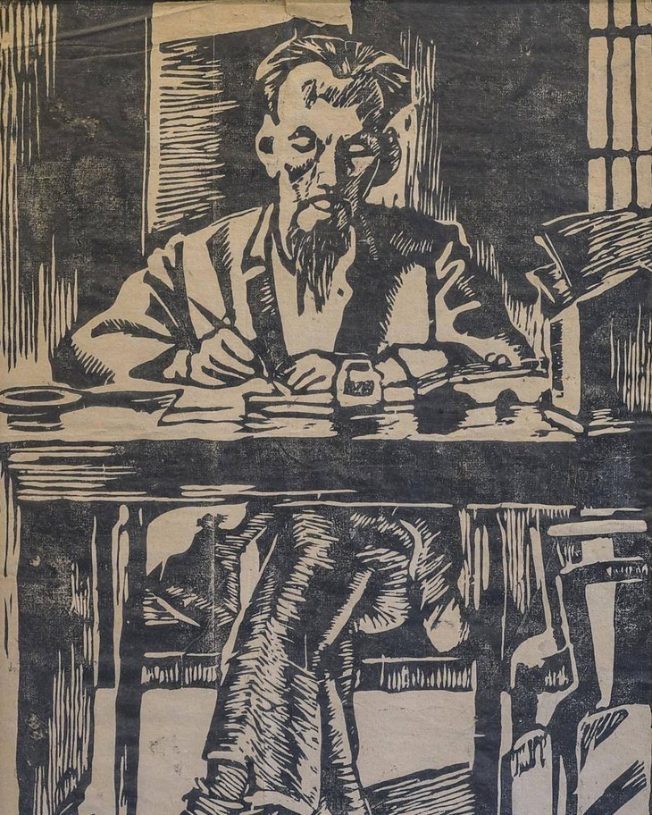 | El presidente Ho Chi Minh trabaja en el Palacio de Tonkin (ahora Palacio Presidencial) - 1946, xilografía, pintor To Ngoc Van. |