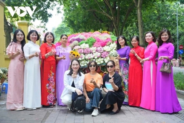 Las mujeres vestidas con elegantes túnicas y junto a cestas de flores en calles capitalinas hacen que las flores sean más hermosas que nunca. (Foto: qdnd.vn) |