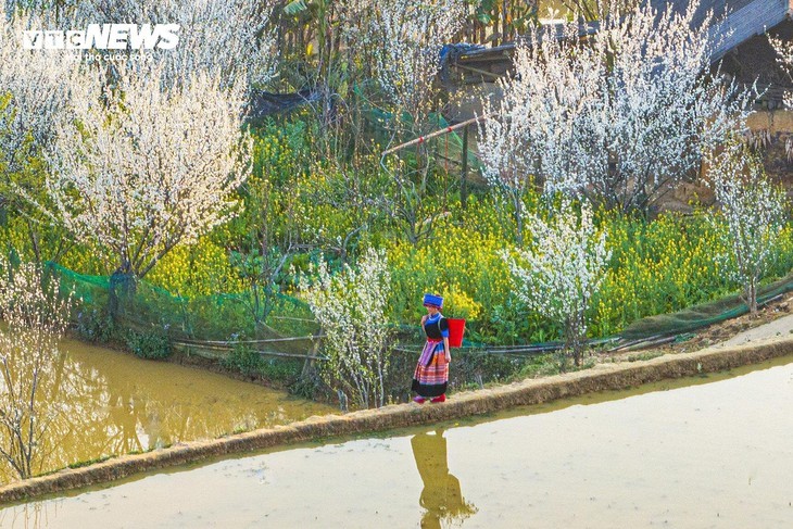 Las flores blancas contrastan con el cielo azul claro, mezclándose con el color rozado de las flores de melocotón y el amarillo de las flores de colza, haciendo de Ta Van Chu una pintura multicolor en el corazón de las vastas colinas y montañas. |