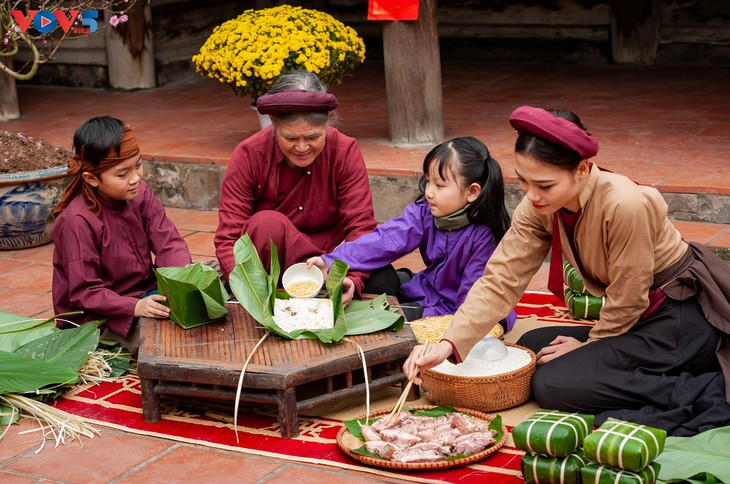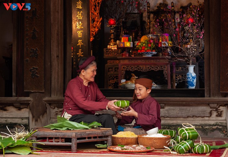 | Hoy en día, se puede comprar Banh Chung (pastel del Tet). Pero en el pasado, todas las familias hacían estos pasteles ellos mismos usando arroz glutinoso, carne de cerdo y frijol verde. |