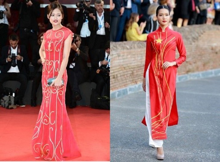 La actriz Thuy Anh (izquierda) usó un vestido Chula en el Festival de Cine de Venecia 2014 y la miss Thuy Dung llevó otro en el Festival Cultural de Roma, en 2015. (Fuente: ngoisao.net) |