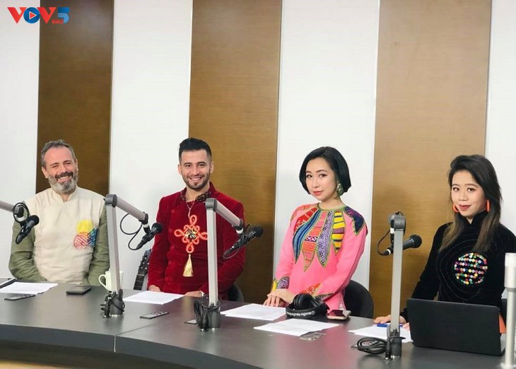 Diego Chula comparte sobre sus diseños de "ao dai" en VOV5. (Foto: Duc Anh / VOV5) |