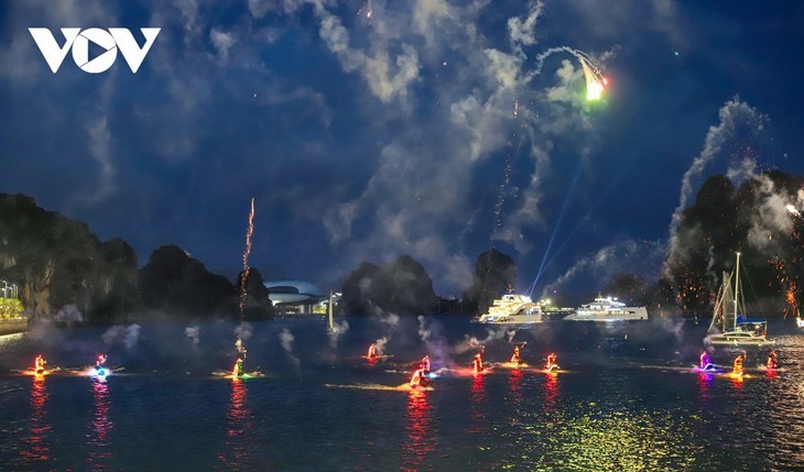 A partir de las 5 de la tarde, más de 50 vehículos acuáticos y aéreos se instalan en el “escenario”, que es el área acuática frente al Parque de Flores de Ha Long. El telón de fondo son las islas rocosas de la bahía de Ha Long, lo que hace que los espectáculos sean únicos. |