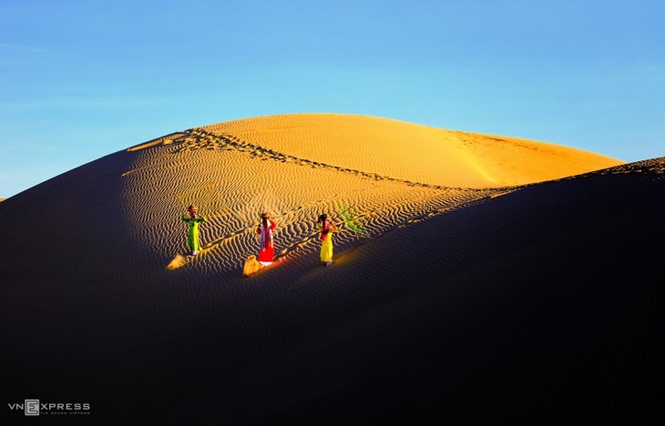 Las dunas de arena se extienden hasta el horizonte como una tira de seda. Paso a paso sobre las dunas, se siente la "ternura" de los diminutos granos de arena, suaves como el terciopelo que abrazan los pies. Foto: vnexpress |
