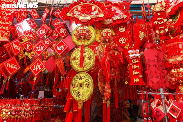 Estos días, el icónico rojo del Tet llena la calle Hang Ma, atrayendo multitudes de compradores y visitantes. |