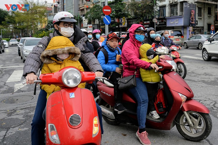 | En la mañana del 2 de marzo, los estudiantes de Hanói también comenzaron a regresar a la escuela. Hacía frío, pero muchos padres llevaban temprano a sus hijos a la escuela. |