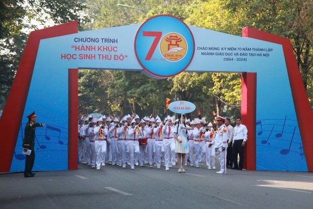 El 10 de noviembre, en la zona peatonal aledaña al lago Hoan Kiem, el Servicio de Educación y Formación de Hanói celebró un evento denominado "Marcha de los estudiantes de la capital", la primera de una serie de actividades para conmemorar el aniversario. (Foto: Hong Phuong/Periódico)
