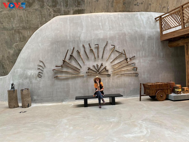 | La arquitectura del edificio está inspirada en las casas tradicionales de la etnia Ede y el techo de las casas comunales (Nha rong) de Tay Nguyen. |