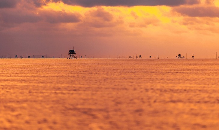 Lo que diferencia a Quang Lang de otras playas es su fascinante topografía. Cuando la marea baja, el agua cubre sólo ligeramente la playa, llegando apenas a los tobillos. |