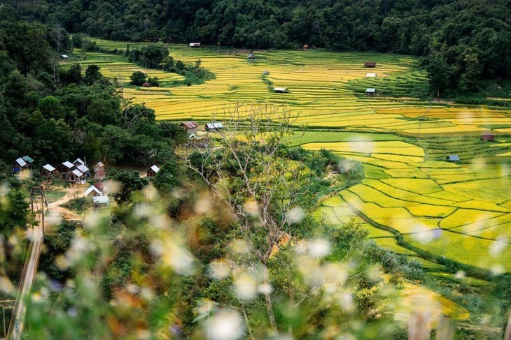 A partir de finales de mayo, las terrazas de arroz de la aldea de Kon Tu Rang (distrito de Kon Plong, provincia de Kon Tum) cambian de color, exhibiendo una imagen dorada brillante. Foto: Hi Mang Den. |