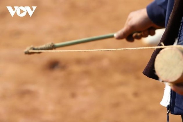 La cuerda del trompo, llamada “Lua” en lengua Mong, está hecha de lino, tiene más de un metro de largo y está atada en un extremo a un Pa, una ramita del ancho de un pulgar de entre 40 y 60 cm de largo. |