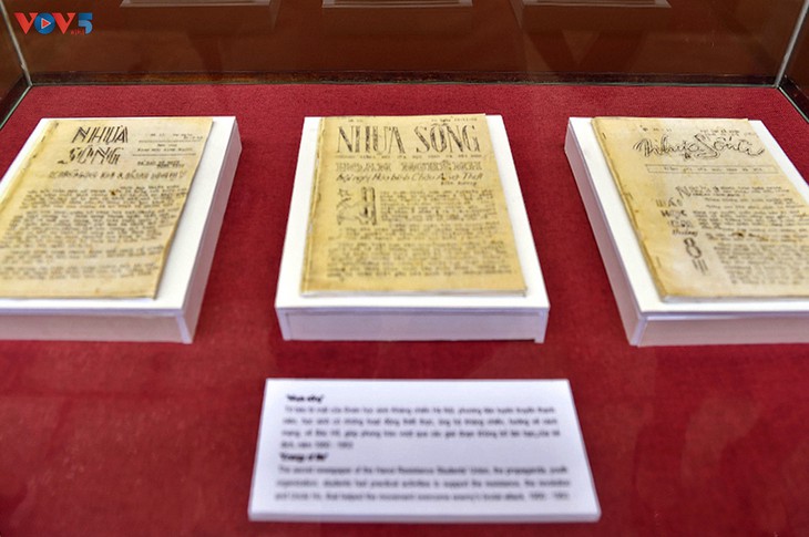 | Ediciones de “Nhua Song” (Semilla de vida), un periódico que operaba en secreto en las escuelas de Hanói durante los años de guerra, se presentan aquí. |