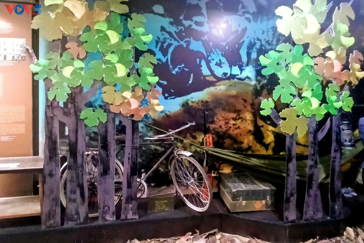 | Los visitantes también pueden experimentar otras experiencias interesantes, como disfrazarse de conductores de la ruta de Truong Son y hacerse fotografías al lado de equipajes de los soldados. |