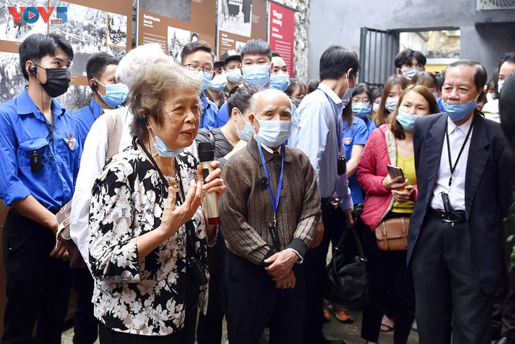 | La señora Do Hong Phan, que participó en un movimiento de resistencia estudiantil en 1949, expresó: “Aquí puedo ver fotografías y documentos que me llevan al pasado y me traen recuerdos, conocer a los jóvenes de hoy y contarles sobre el pasado”. |