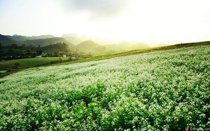 Una colina cubierta de mostaza blanca en flor en Moc Chau. Foto: vfo.vn |