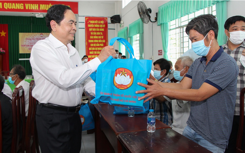 El presidente del Frente de la Patria de Vietnam, Tran Thanh Man, entrega regalos del Tet a familias de escasos recursos en la comuna de Thanh Xuan, de la provincia de Hau Giang. (Foto: nhandan.com.vn)
