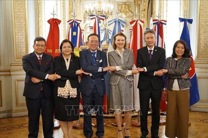 La ministra de Relaciones Exteriores, Comercio Internacional y Culto de Argentina, Diana Mondino (tercera desde la derecha), y los embajadores de Vietnam, Tailandia, Indonesia, Filipinas y Malasia. (Foto: VNA) |