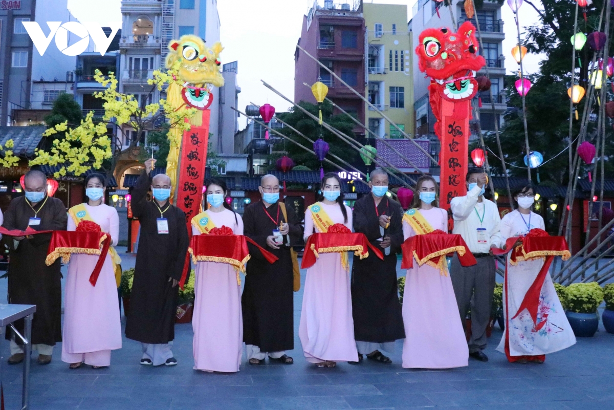 El espacio del festival está decorado con elementos budistas con el objetivo de crear un ambiente cálido y pacífico en los días del Tet.