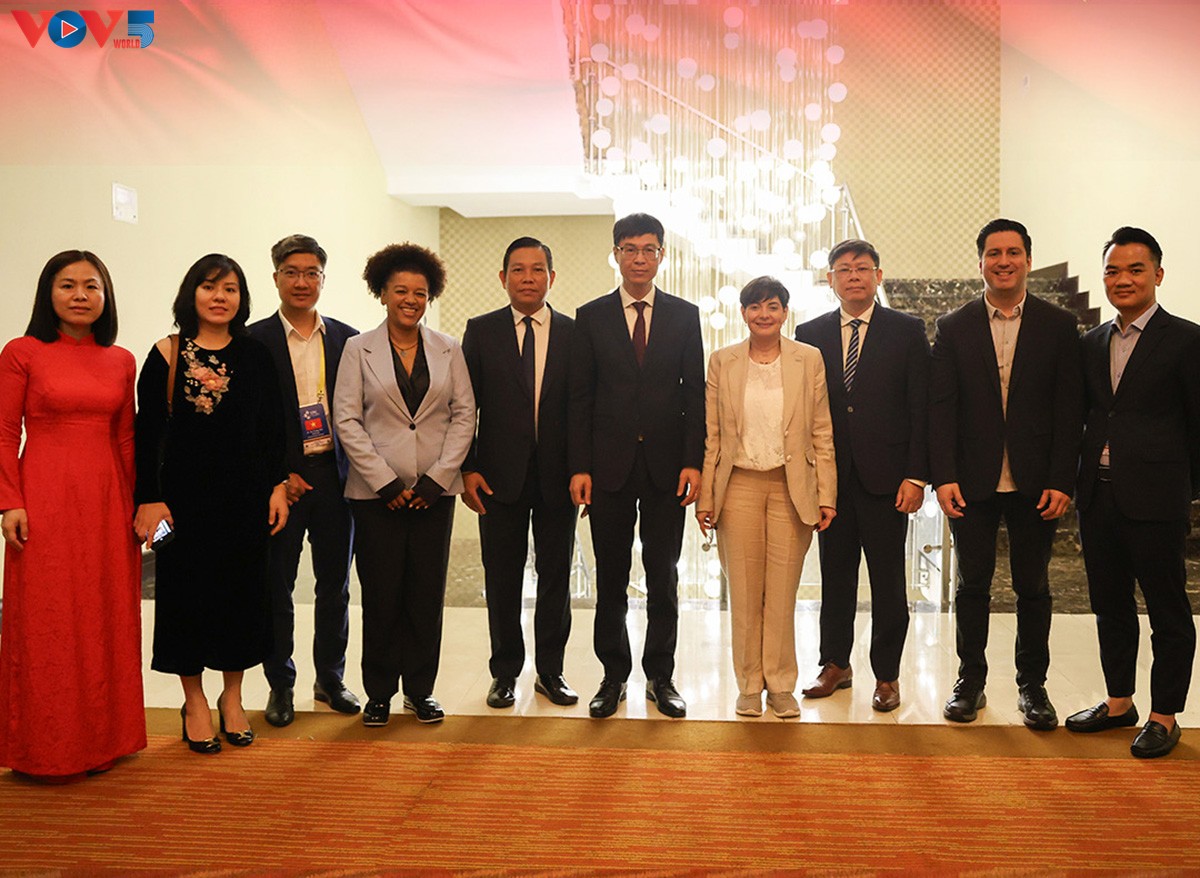 La vicepresidenta y ministra de Ciencia y Tecnología de Venezuela, Gabriela Jiménez Ramírez, recibe a la delegación del Ministerio de Ciencia y Tecnología de Vietnam. (Foto: Phạm Huân/ VOV) |