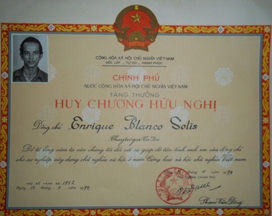 Diploma firmado por el primer ministro vietnamita Pham Van Dong, otro de los reconocimientos entregados a Enrique en la patria anamita.
